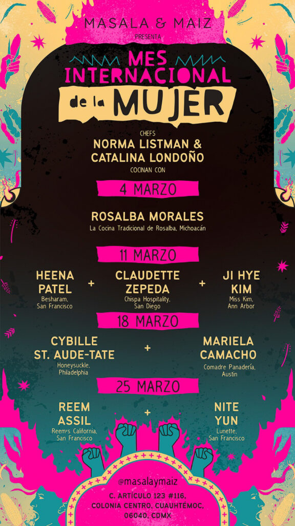 La chef fundadora, Norma Listman y la chef Catalina Londoño, transforman a Masala y Maíz en un entorno de apoyo y celebración, donde el trabajo gastronómico de Rosalba Morales, Heena Patel, Cybille St. Aude-Tate, Mariela Camacho, Nite Yun y Reem Assil toma protagonismo. Cada miércoles, el restaurante presentará una cena en colaboración con una a tres chefs que pondrán al frente relatos personales para brindar una experiencia gastronómica única y llena de historia.
